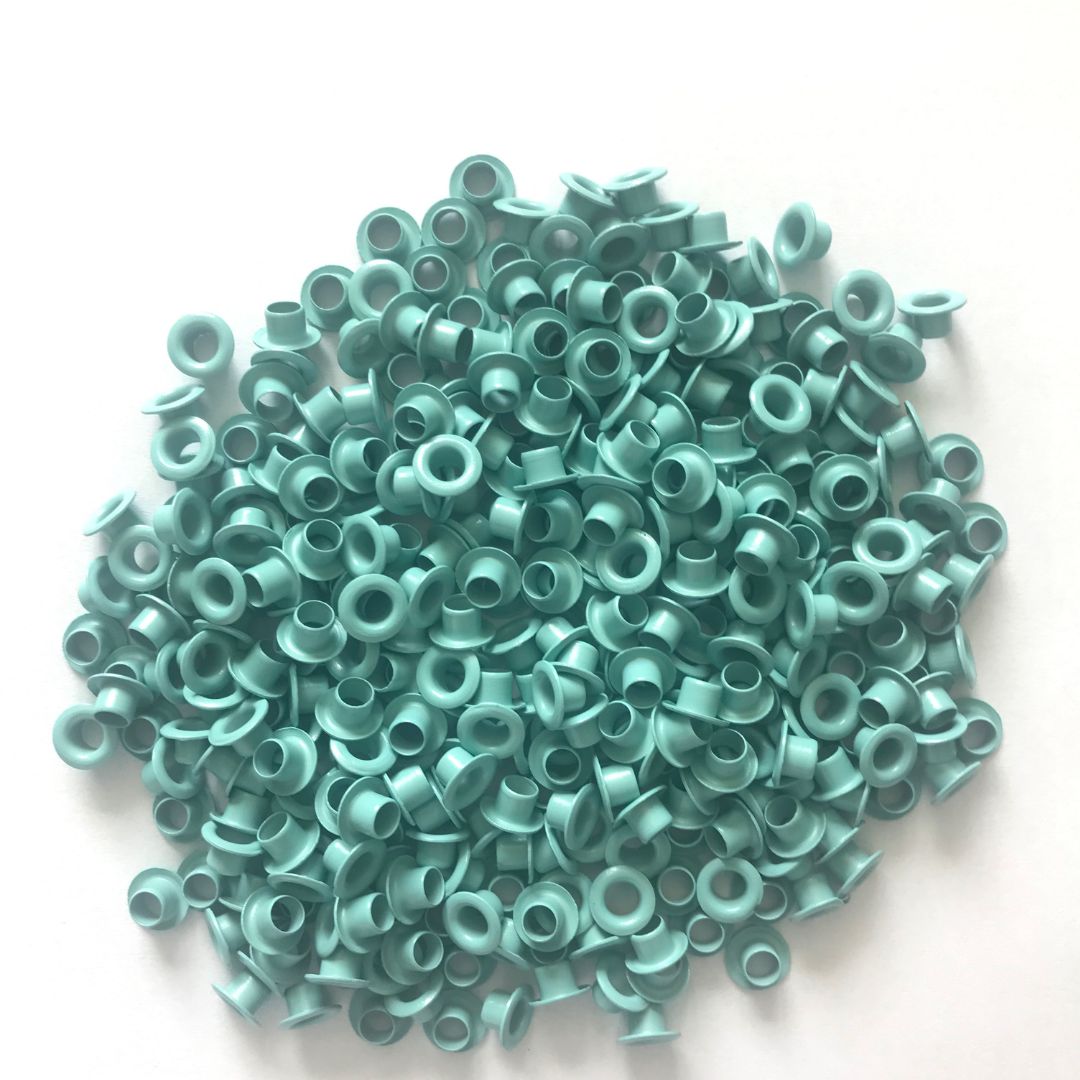 Ilhos de aluminio, tamanho 54, pintado na cor verde água.